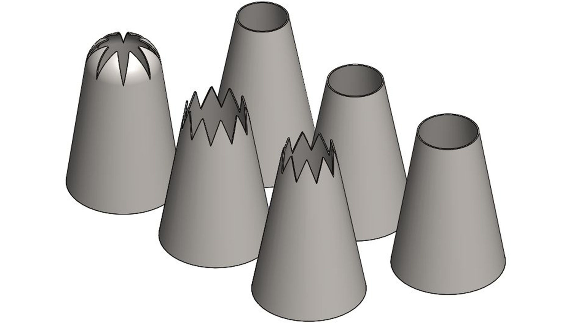 Satz (6 Stück) Dekortüllen aus Edelstahl rostfrei (drei Rundtüllen, drei Sterntüllen). Passend zu Auslaufrohr 90°, Auslaufrohr 45° und elektrischer Handpistole Artikelnummer:A139 232System:EinzelauslaufAbmessungen: